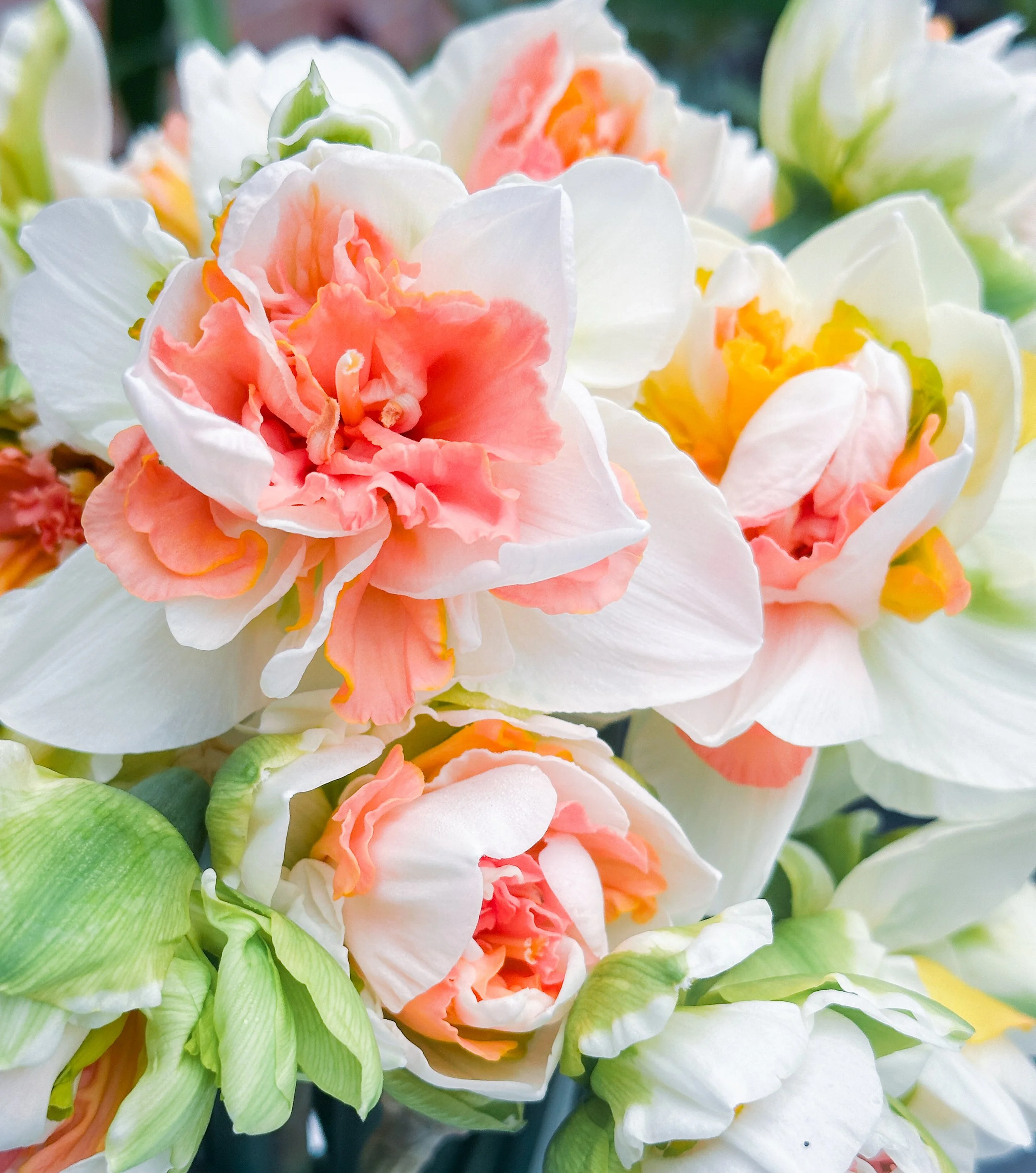 We pair our heirloom narcissus with early tulips, hellebores, flowering branches, etc. to create stunning early Spring bouquets for the “Daffodil Days” bouquet club membership.